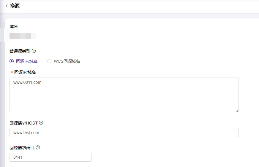 如下加速域名的回源域名为www.0011.com,回源host域名为www.test.com,回源端口为8141。