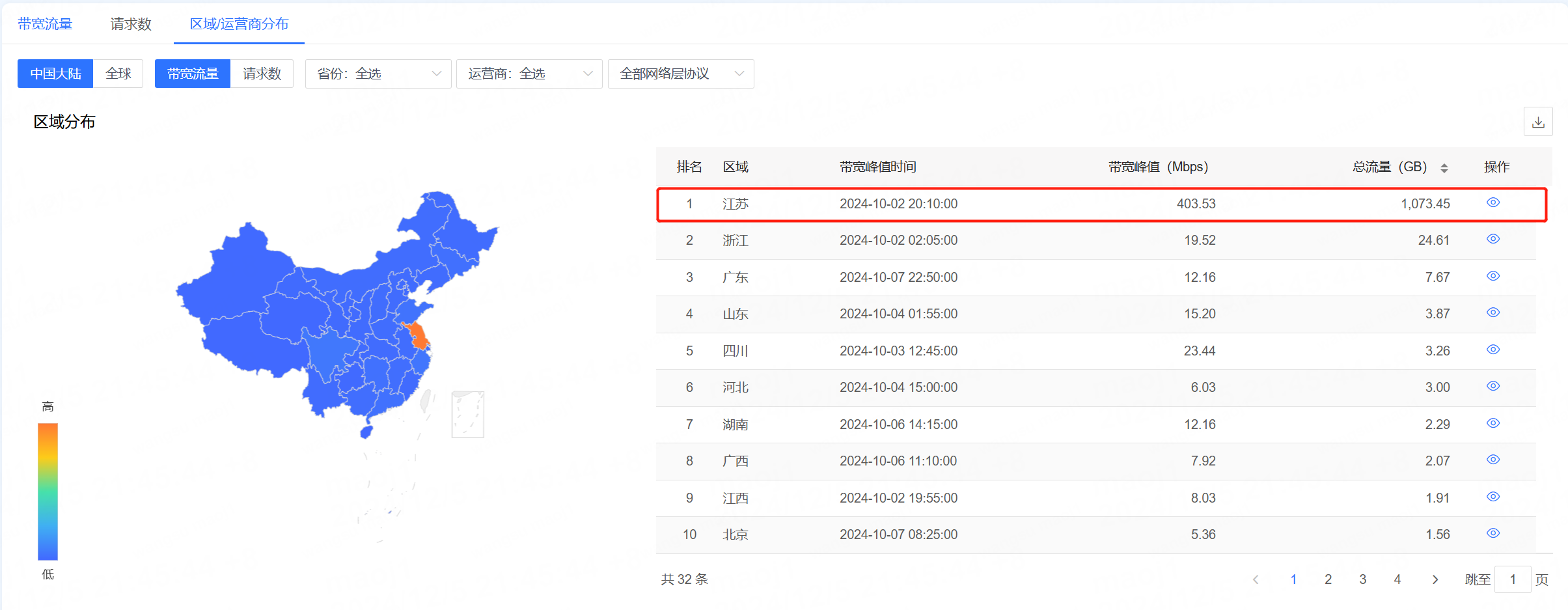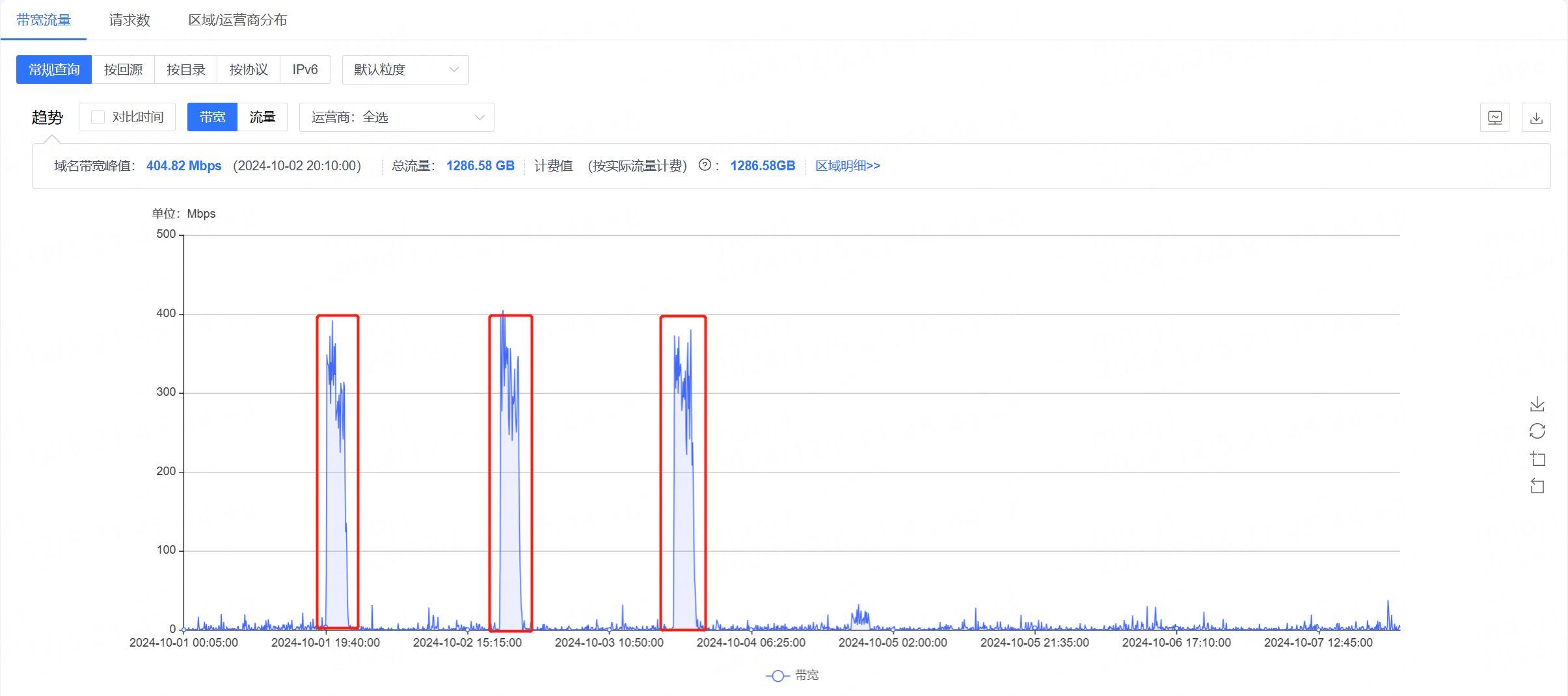 - 在用量分析页面,筛选存在疑似流量盗刷域名和时间段,查看带宽流量图中是否有非预期的带宽突增,以及区域/运营商分布统计表中总流量是否主要聚集在个别地区。