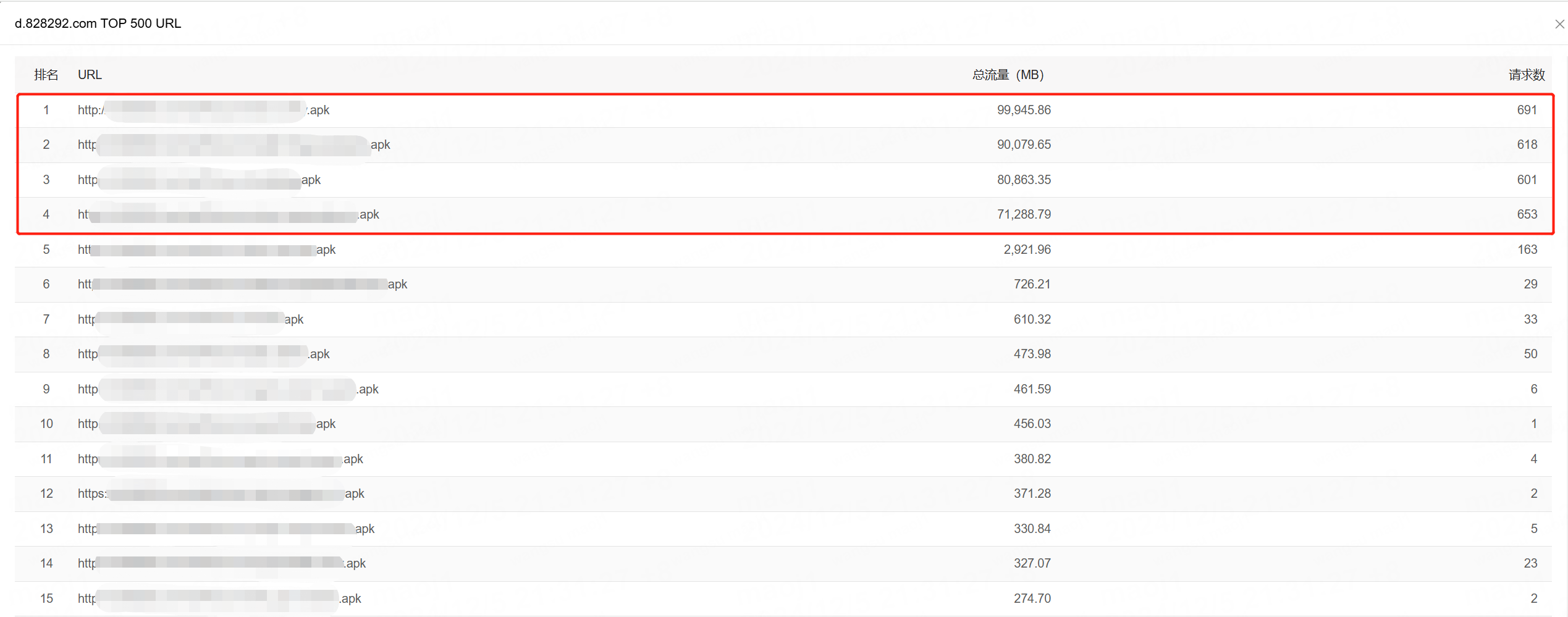 - 在热门排行页面,筛选存在带宽突增的域名和时间段。在域名页签下,查看TOP URL统计表中排名前列的URL总流量是否远高于其他URL,以及TOP 访客统计表中排名前列IP是否呈现聚集性(比如同一个IP C段)。