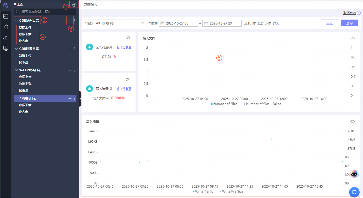 | ② | 查看日志接入情况 | 点击已接入的日志,右侧区域显示相应的报表,可查看日志的接入任务,如:文件数量、写入流量、写入大小、上传成功率等。 |