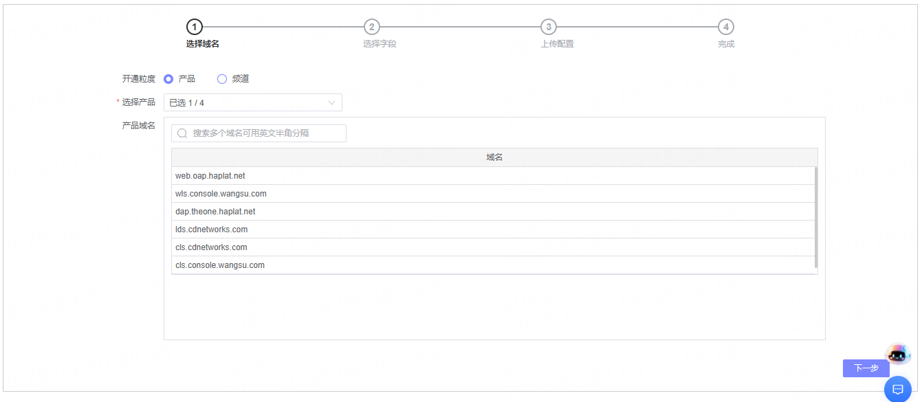 | 开通粒度 | 支持按产品或频道选择所需域名。 选择产品后,默认开通所选产品下的全部域名。 按频道开通时,需指定频道,并可通过选择产品筛选频道。 |