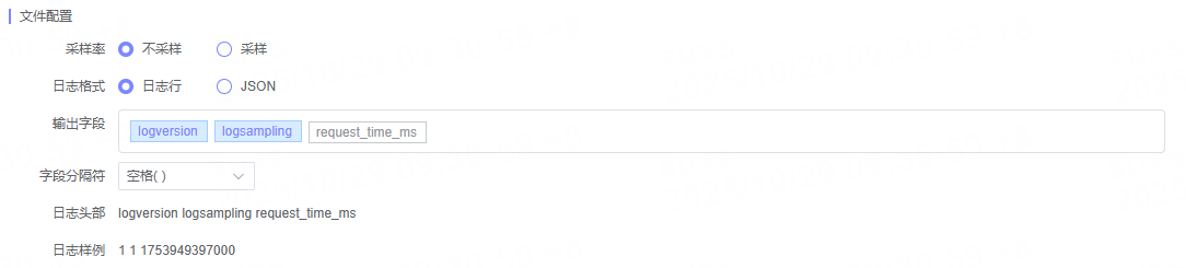 | 输出字段 | 当日志格式为日志行时可调整选中字段顺序或删除已选字段。系统字段如logversion、logsampling及时间字段不可删除或调整顺序。 |