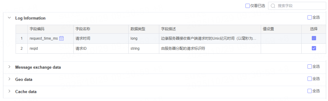 您可根据需求选择日志字段。界面将显示日志字段分类(仅平台原生数据提供)、字段编码、字段名称、数据类型和字段描述。