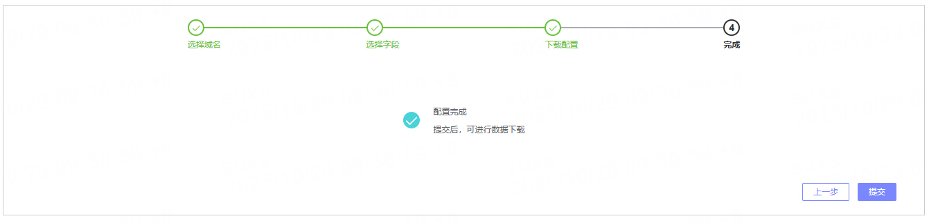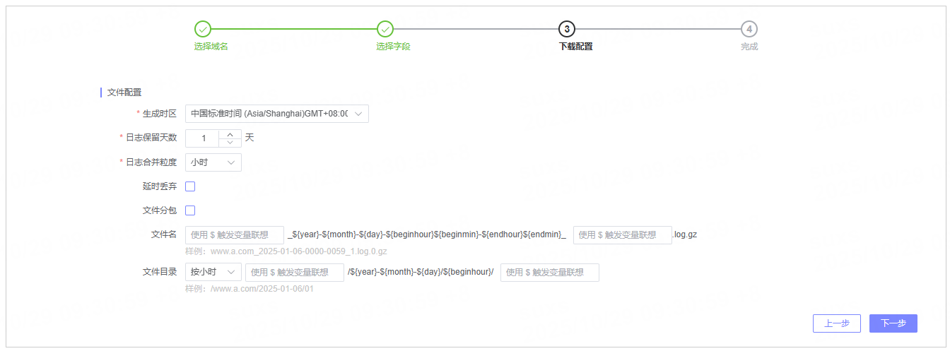 支持指定目标域名(仅平台原生数据提供)、选择日志字段及日志格式,实现精准的数据下载。