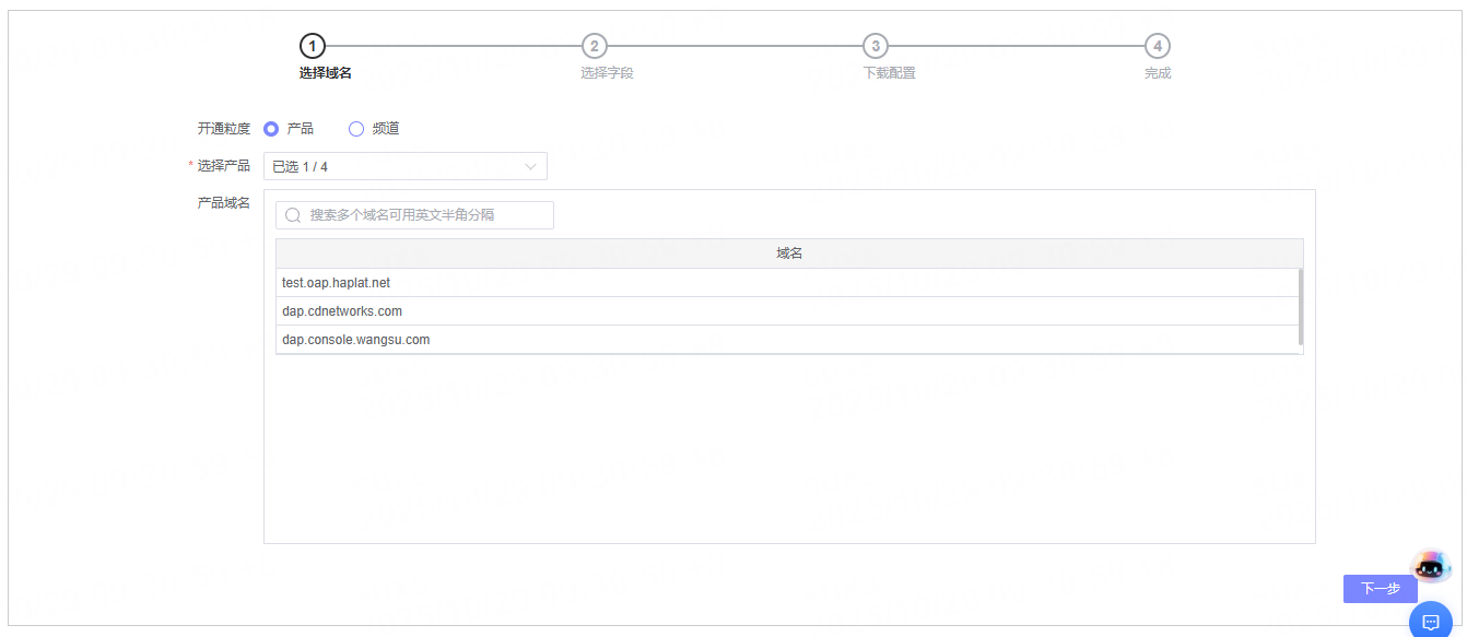 | 开通粒度 | 支持按产品或频道选择域名。按产品开通时默认所选产品下全部域名开通。按频道开通时需指定频道,并可通过选择产品筛选频道。 |