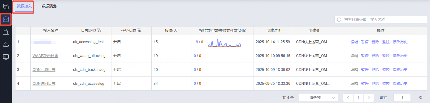 任务列表显示创建的所有接入任务,可通过搜索或表头筛选找到所需的任务。