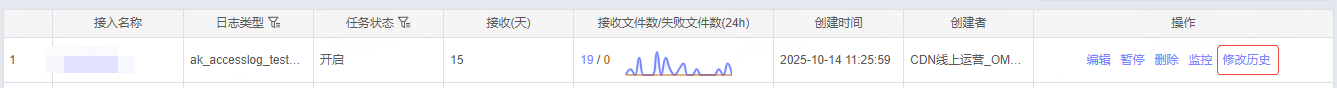 在接入任务管理的操作栏中,选择修改历史操作。