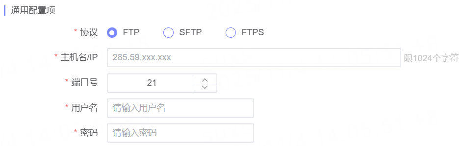 | 端口号 | FTP 和 FTPS 默认端口为 21,SFTP 默认端口为 22。 |
