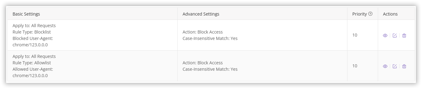 • The system supports only one allowlist rule. If multiple User-Agent values are needed, they must all be included within this single allowlist.