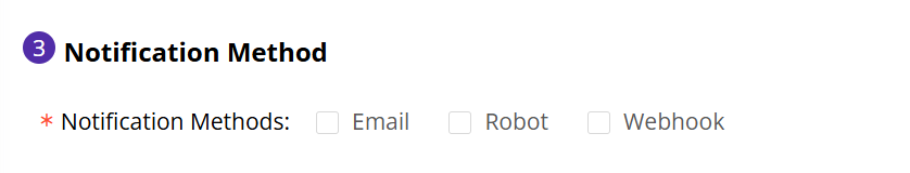 - Notification Methods: Choose the channels for sending notifications, including Email, Robot, and Webhook.