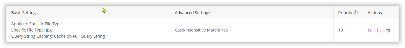 In the rule configuration shown below, when the user requests files of type jpg, all query string parameters in the URL will be used as caching criteria. If any parameter value in the query string is different, a separate cache entity will be cached at the CDN side. When there is no cache hit at the CDN, the complete request URL will be used to fetch the file from the origin. When a user accesses http://domain/1.jpg?version=1&name=john, if there is no cache hit at the CDN, the CDN servers will fetch the file from http://domain/1.jpg?version=1&name=john and cache it at the platform. The next time the user requests the URL http://domain/1.jpg?version=1&name=john, it will directly hit the cache at the CDN. If the next user request URL is http://domain/1.jpg?version=2&name=john, it will not hit the cache.
