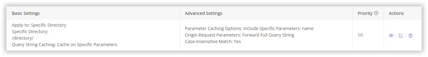In the rule configuration shown below, when the user requests a URL in the /directory/ directory, the parameter name in the query string will be used as a caching criteria. If the value of the name parameter in the query string is different, a separate cache entity will be cached at the CDN side. When there is no cache hit at the CDN, the complete request URL will be used to fetch the file from the origin. When a user accesses http://domain/1.jpg?version=1&name=john&year=1991, if there is no cache hit at the CDN, the CDN servers will fetch the file http://domain/1.jpg?version=1&name=john&year=1991 from origin and cache it on the platform. The next time the user requests the URL http://domain/1.jpg?version=2&name=john&year=1991, it will directly hit the cache at the CDN. If the next user request URL is http://domain/1.jpg?version=1&name=sam&year=1991, it will not hit the cache.