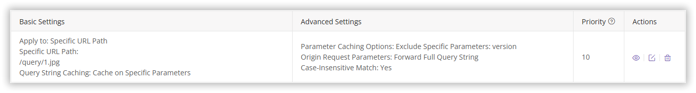 In the rule configuration shown below, query string parameters in the URL are not used as caching criteria. As long as the path before the question mark in the request URL is the same, there will be only one cache object on CDN platform, meaning all requests for the domain associated with this rule will ignore the query string for caching or fetching the file from the origin. When a user accesses http://domain/a.jpg?version=1, if there is no cache hit at the CDN side, the CDN servers will fetch the file from http://domain/a.jpg and cache it on the CDN servers. The next time the user requests the URL http://domain/a.jpg?version=2, it will directly hit the cache at the CDN side.