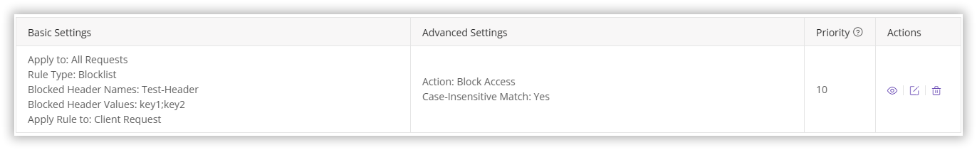 | Blocklist | When setting up a blocklist, you need to specify the custom request headers and their corresponding values that are not allowed:Blocked Header Names: This is the name of the custom HTTP request header that needs to be validated. Please note that each blocklist can only include one header name.Blocked Header Values: These are the forbidden header values. If these values are present in the request, access will be denied. You can set multiple prohibited values, separated by ;. |