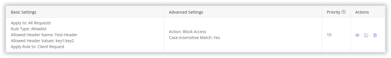 | Allowlist | When setting up an allowlist, just like the blocklist, you need to specify the custom request headers and their corresponding values that are allowed:Allowed Header Name: This is the name of the custom HTTP request header that needs to be validated. Similarly, each allowlist can only include one header name.Allowed Header Values: These are the permitted header values. Access is only allowed if these values are present in the request. You can set multiple allowed values, separated by ;. |