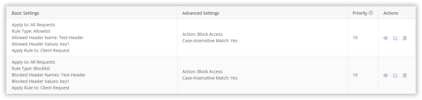 Test-Header with value key1, it matches the blocklist rule, resulting in denied access.Test-Header with a value other than key1, it won’t be blocked by the blocklist but will fail to meet the allowlist (which allows only the Test-Header with value of key1), resulting in access being denied.If you need to configure both a blocklist and an allowlist, please contact our Customer Service for assistance to ensure proper setup.