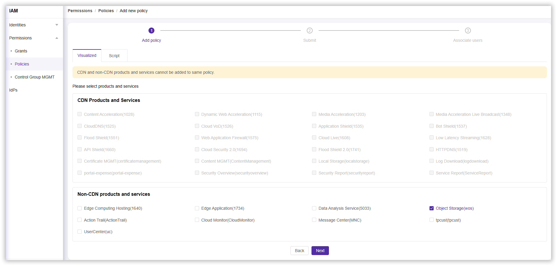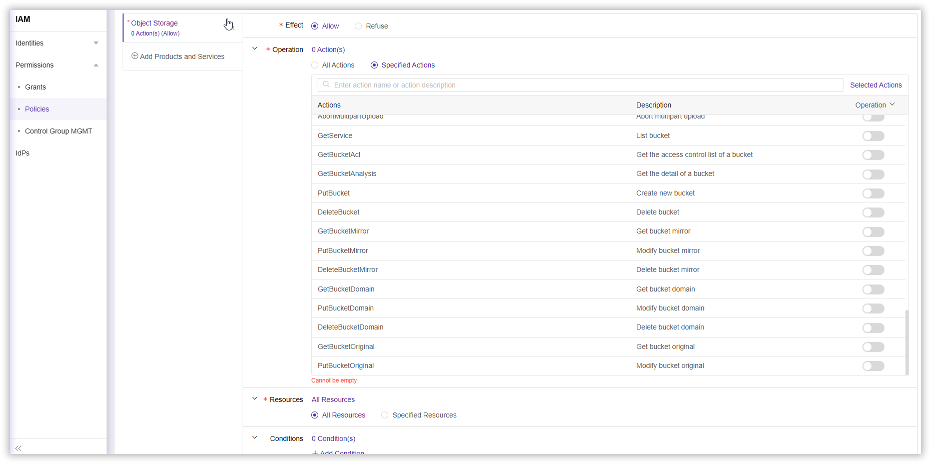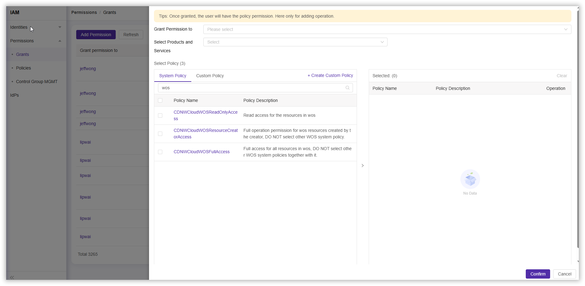 | CDNWCloudWOSReadOnlyAccess | All WOS Resources (Object Storage) | Read-Only Access: Provides read access to all resources in WOS (Object Storage) |