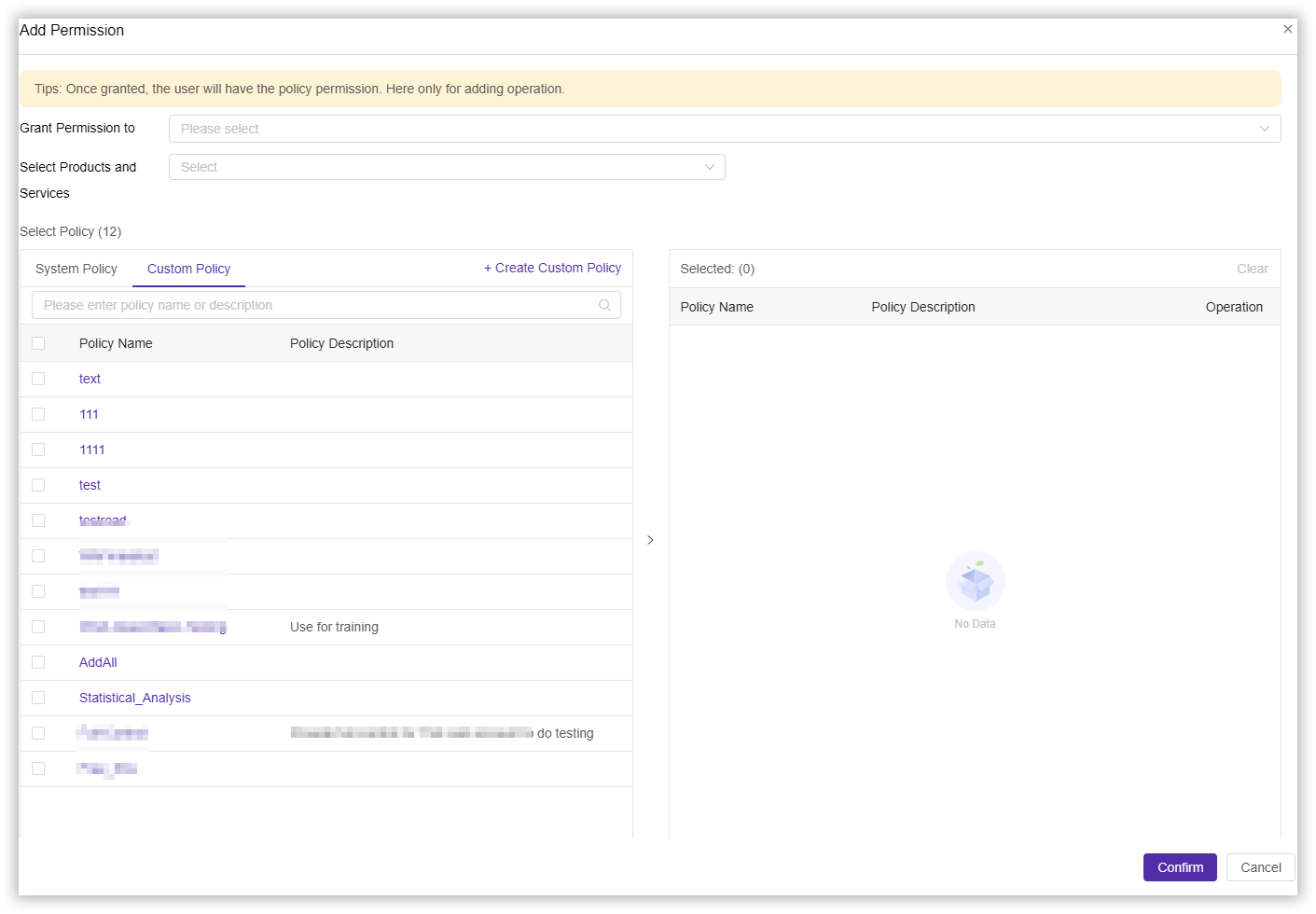 Note: System will use the smaller/smallest policy when you grant multiple system policies to sub accounts. If you want to grant FullAccess permission, please just authorize