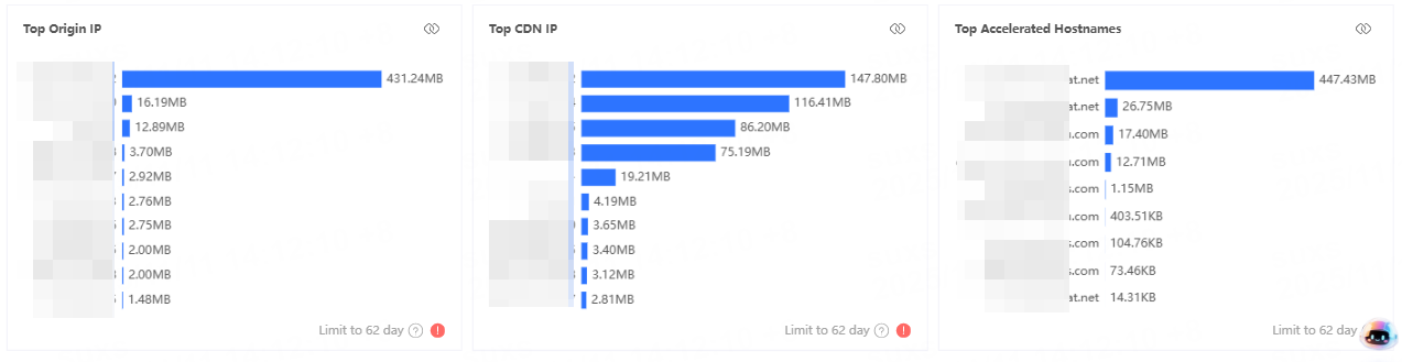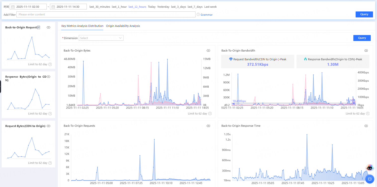 | Key Metrics Analysis | Provides statistics on traffic and bandwidth between the CDN and the origin. After clicking Key Metrics Analysis, you can view origin traffic, bandwidth, origin response time, top origin IPs by response traffic, top CDN node IPs by response traffic, and top accelerated Domains by response traffic across different dimensions. Bandwidth calculation: By default, uses a 5-minute granularity. Total traffic over 5 minutes × 8 ÷ 300 seconds. Granularity can be adjusted as needed. |