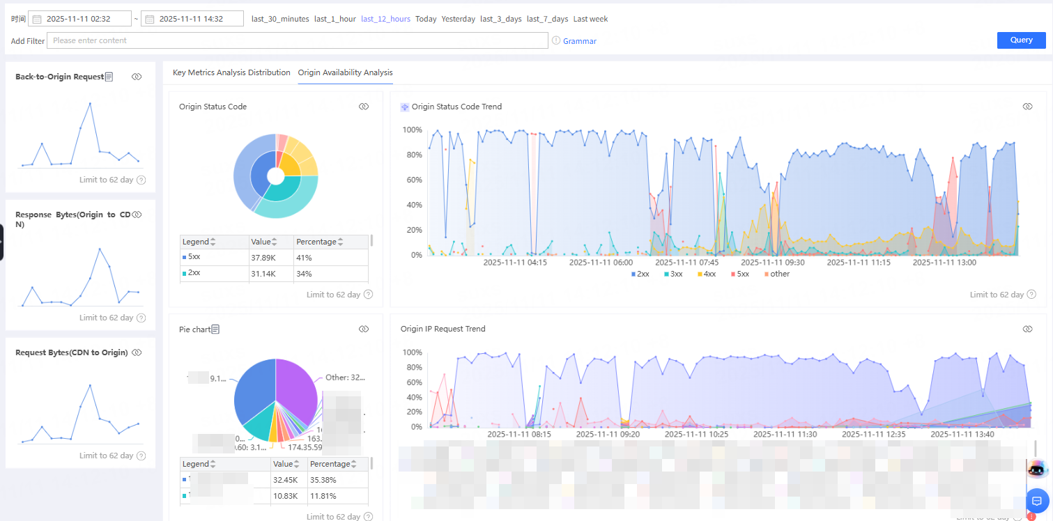 | Origin Availability Analysis | Counts the number of requests initiated by the CDN to the origin as well as the availability of the origin. After clicking Origin Availability Analysis, you can view origin status code trends, origin IP request count trends, origin 5xx error trend analysis, and more. |