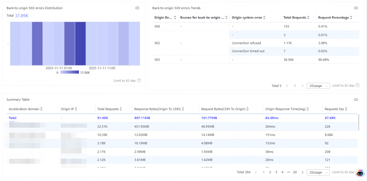 After clicking Back-to-origin Availability Analysis, you can view trends of back-to-origin status codes, changes in the number of requests to origin IPs, reasons for 5xx back-to-origin errors, and more.