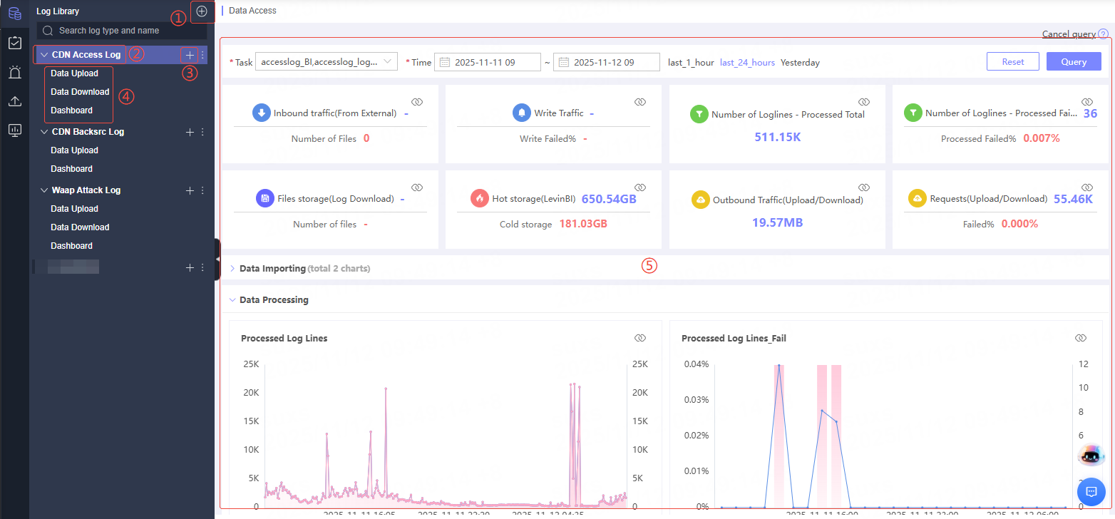 | ① | Create Log Library | Create a new log library. You can select either Platform Native Data or HTTP Access as the log type. For details, see: Create Log Library. |