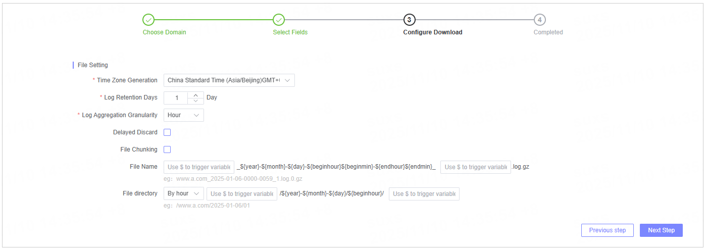 Supports specifying the target Domain (provided only with platform native data), selecting log fields and log formats, to achieve precise data downloads.