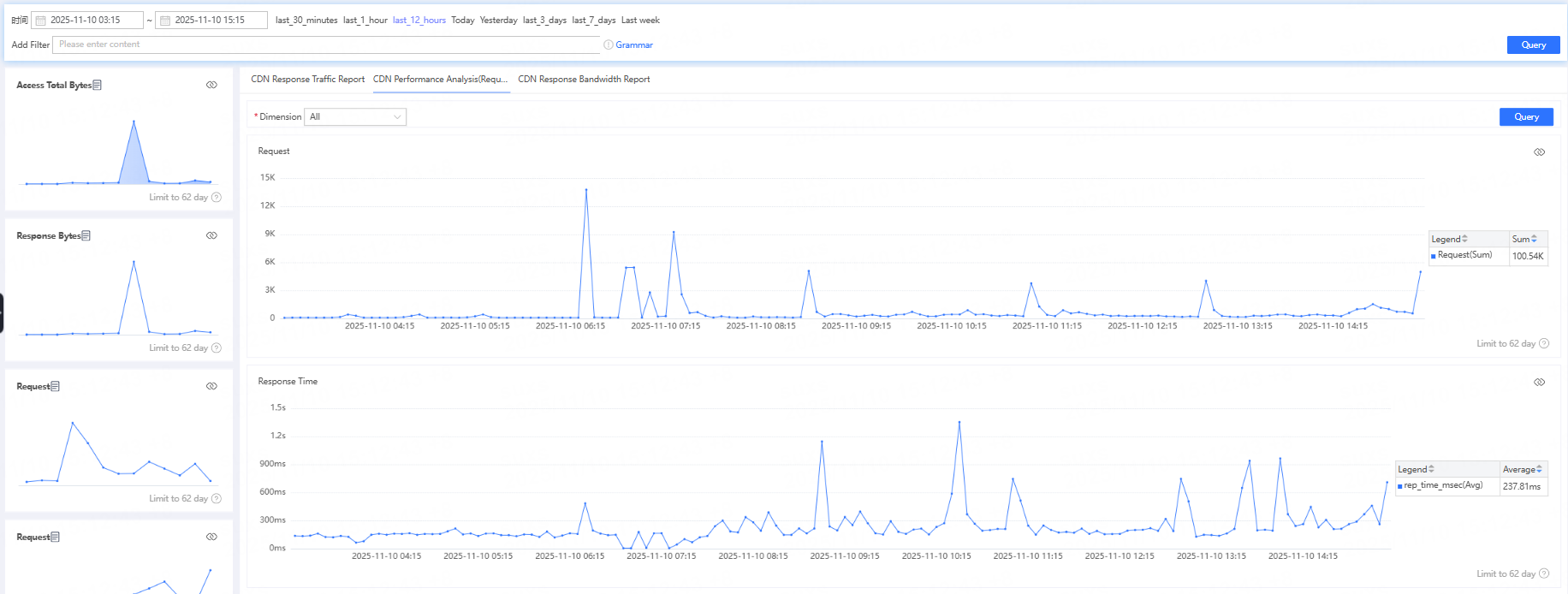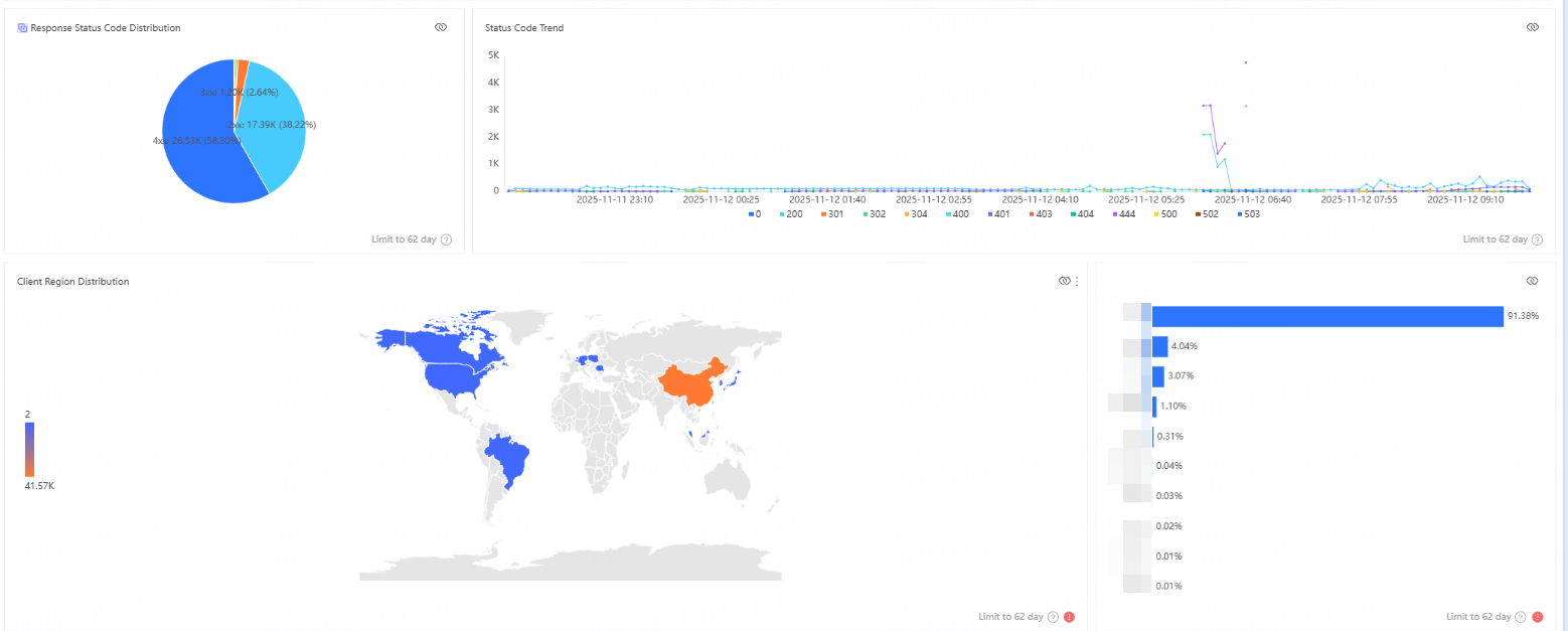 | CDN Access Performance Analysis (Request Count) | Tracks the number of client requests the CDN receives and performance metrics. After clicking CDN Access Performance Analysis, you can view request count trends, response time trends, response code distribution, access region distribution, and other metrics from multiple perspectives. |