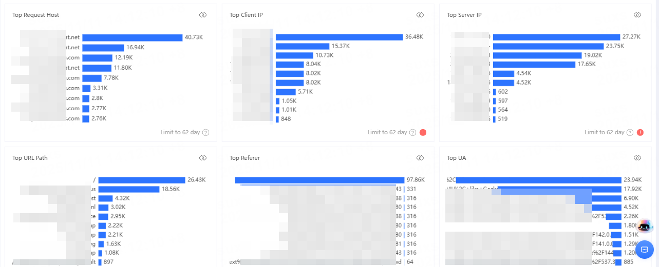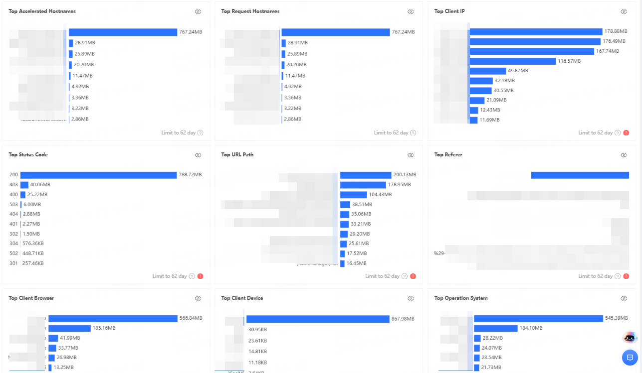 | CDN Response Traffic Analysis | Tracks the traffic transferred between the CDN and clients. Clicking CDN Response Traffic Analysis allows you to view traffic trends across different dimensions, regional traffic distribution, accelerated Host ranking, request Host ranking, client IP ranking, HTTP status code ranking, and more. Bandwidth calculation: By default, it uses a 5-minute granularity, calculated as total traffic within 5 minutes × 8 ÷ 300 seconds. The granularity can be adjusted as needed. |