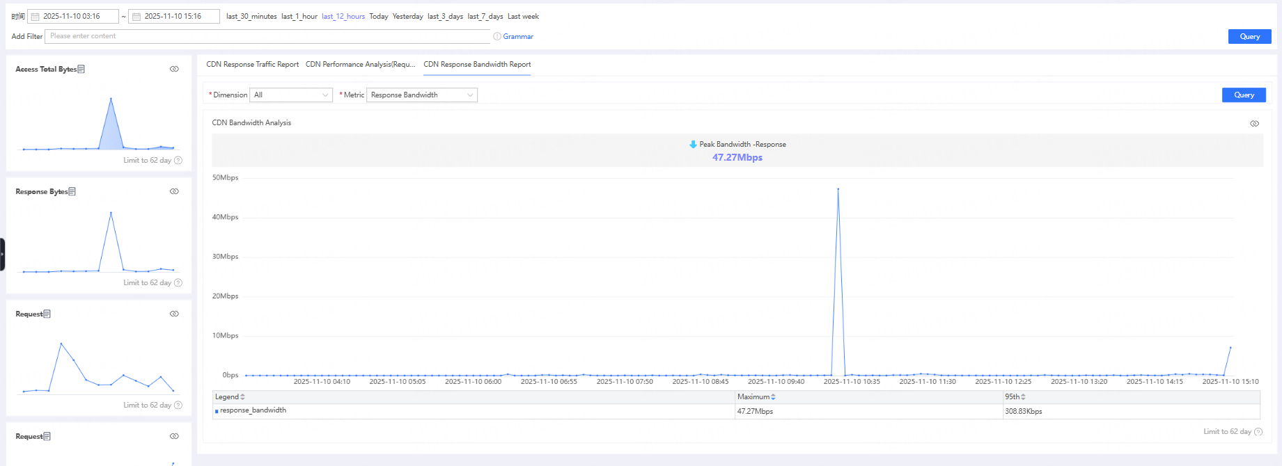 | CDN Response Bandwidth Analysis | Statistics on the bandwidth transmitted between the CDN and the client. After clicking CDN Response Bandwidth Analysis, you can view upstream bandwidth/downstream bandwidth from different dimensions. |