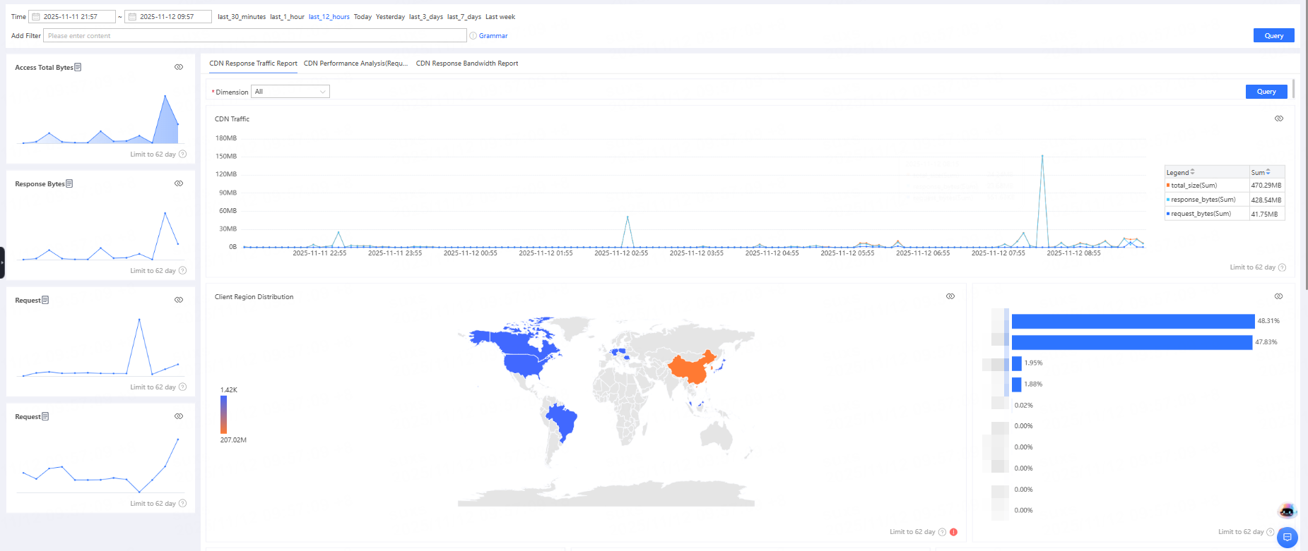 After clicking CDN Response Traffic Analysis, you can view access traffic trends, access region distribution, top accelerated hosts, top requested hosts, top client IPs, top status codes, and more, from different dimensions.