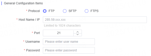 | Username | Enter the access account for FTP, SFTP, or FTPS. |
