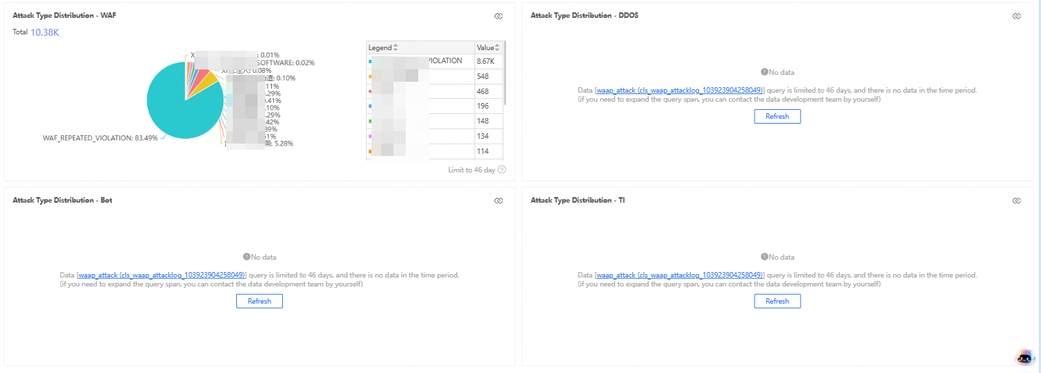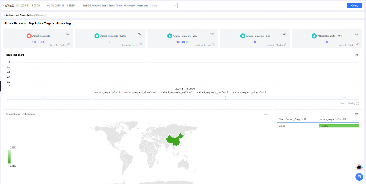 | Attack Overview | Displays indicator rankings by your selected dimensions to identify abnormal access volumes and trends. Click Attack Overview to view attack request counts, distribution by access region, attack types, and more across different dimensions. |