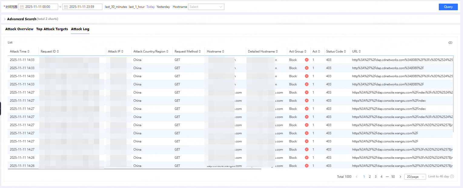 | Top Attack Targets | Ranks top attack targets by different dimensions. Click Top Attack Targets to view the number of requests and attack-defense status for different types of attacks by dimensions such as acceleration domain, URL, Referer, client IP, etc. |