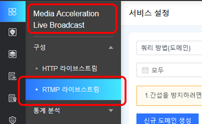 [제품 및 서비스] → [Media Acceleration Live Broadcast] → [구성] → [RTMP 라이브스트림]