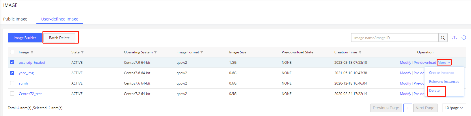 When the custom image is no longer used, the user can delete it, and deleting the image does not affect the instances created using the image.